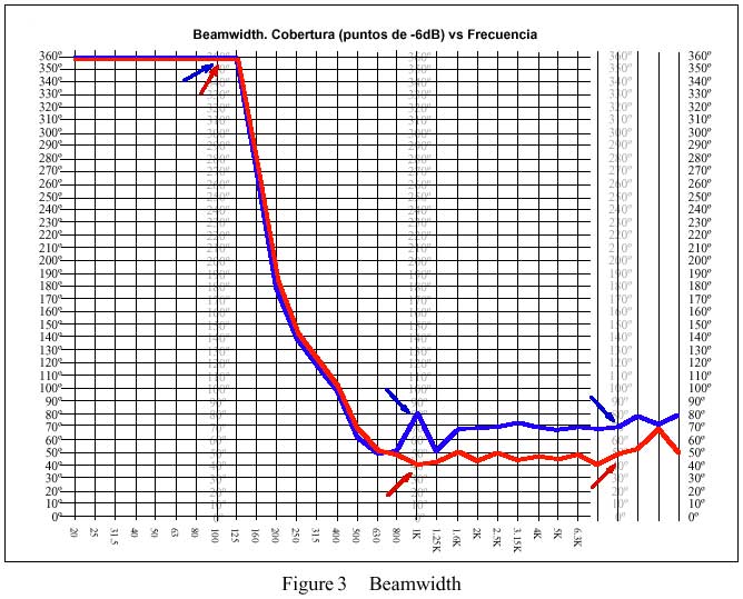 水平、縦の指向範囲は、100Hzにおいて、360°V x 360°H,1kHzにおいて、80°H x 40°V,10 kHz において,70°H x 50°Vとして明らかに識別できます。