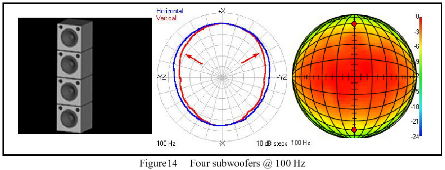 図14は、4個のサブウーハーアレイを示す。(垂直に積み上げられた状態。)指向特性が、120°に縮小したことに注意をしてください。